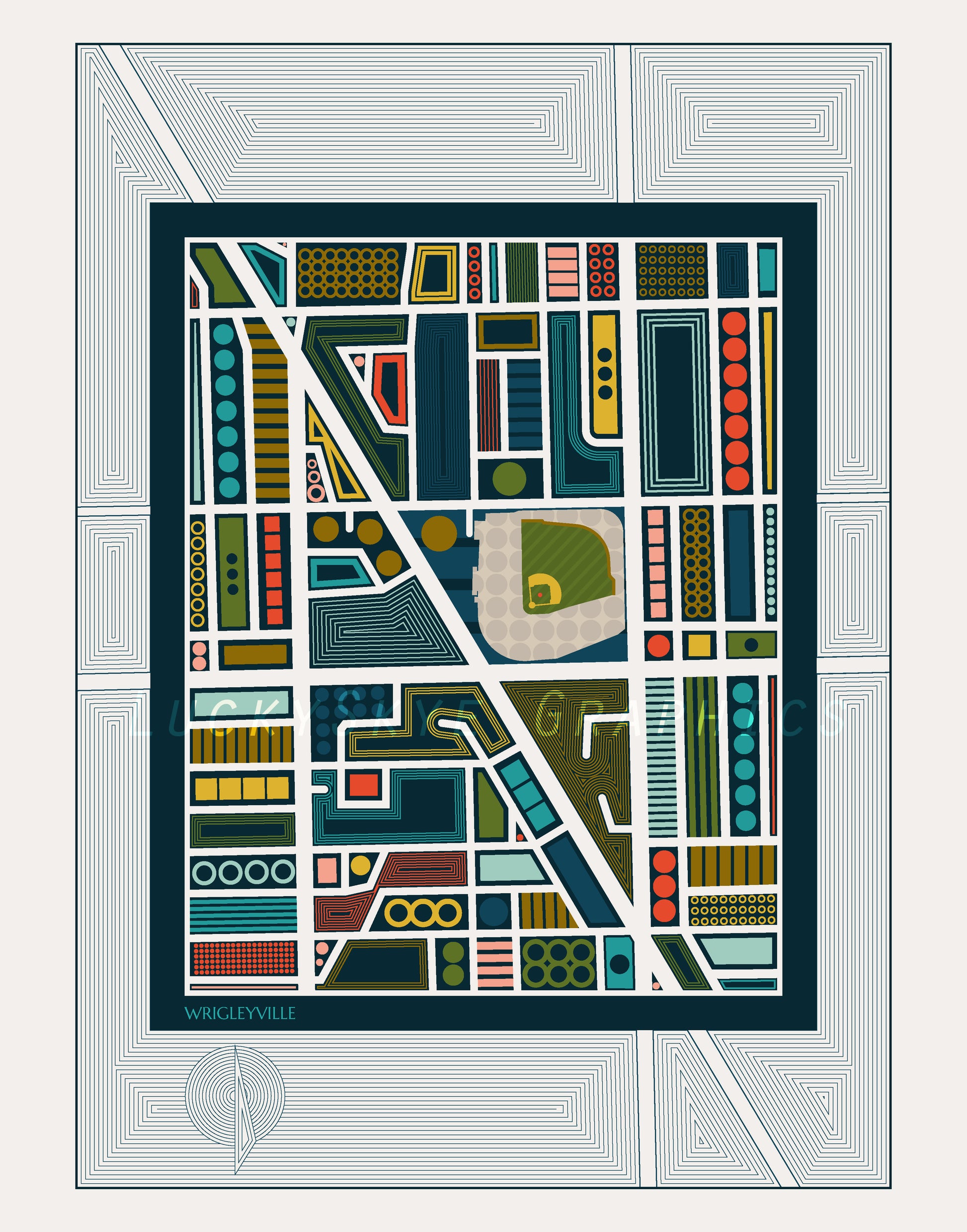 An abstract map of Wrigleyville in Chicago with Wrigley Field.