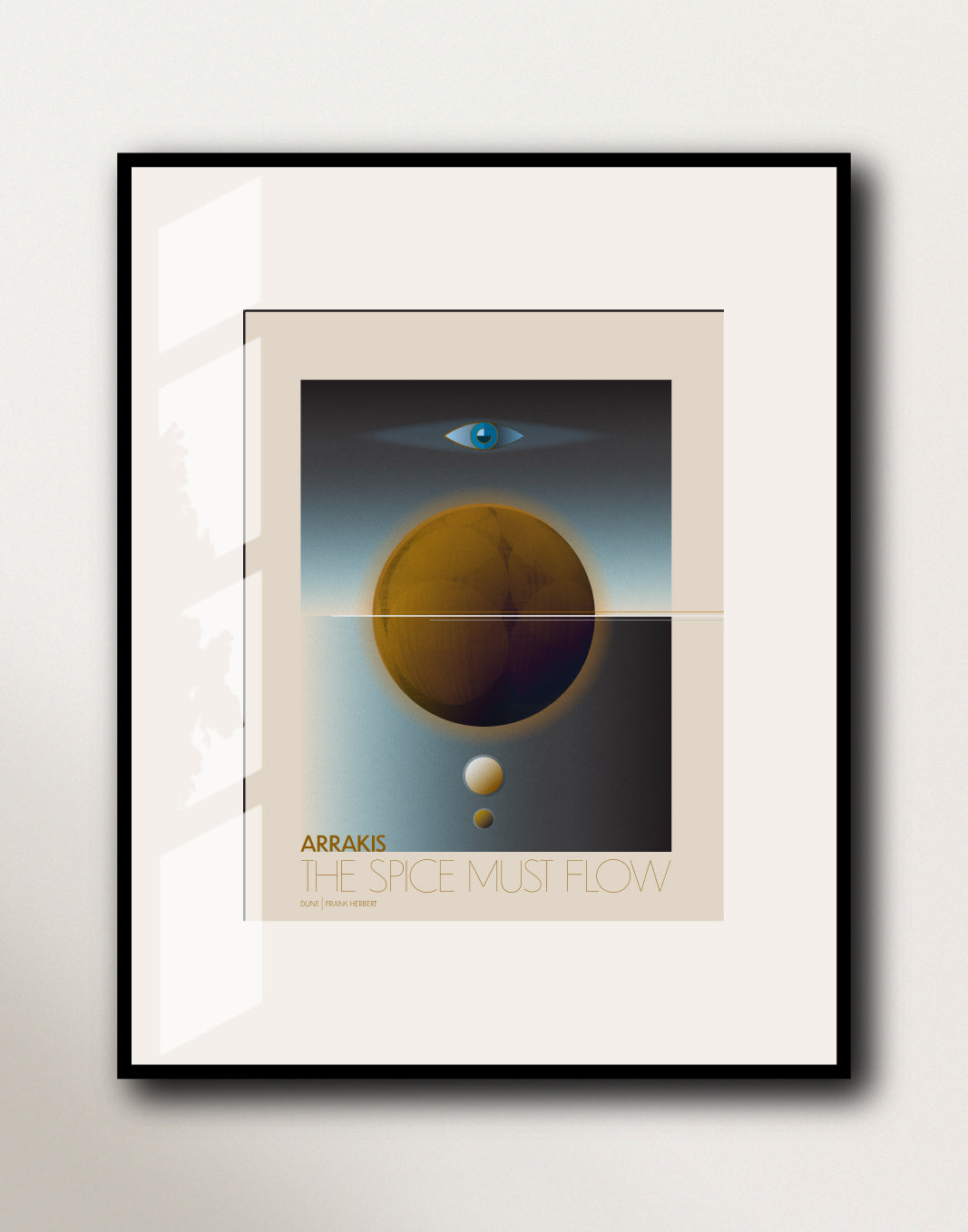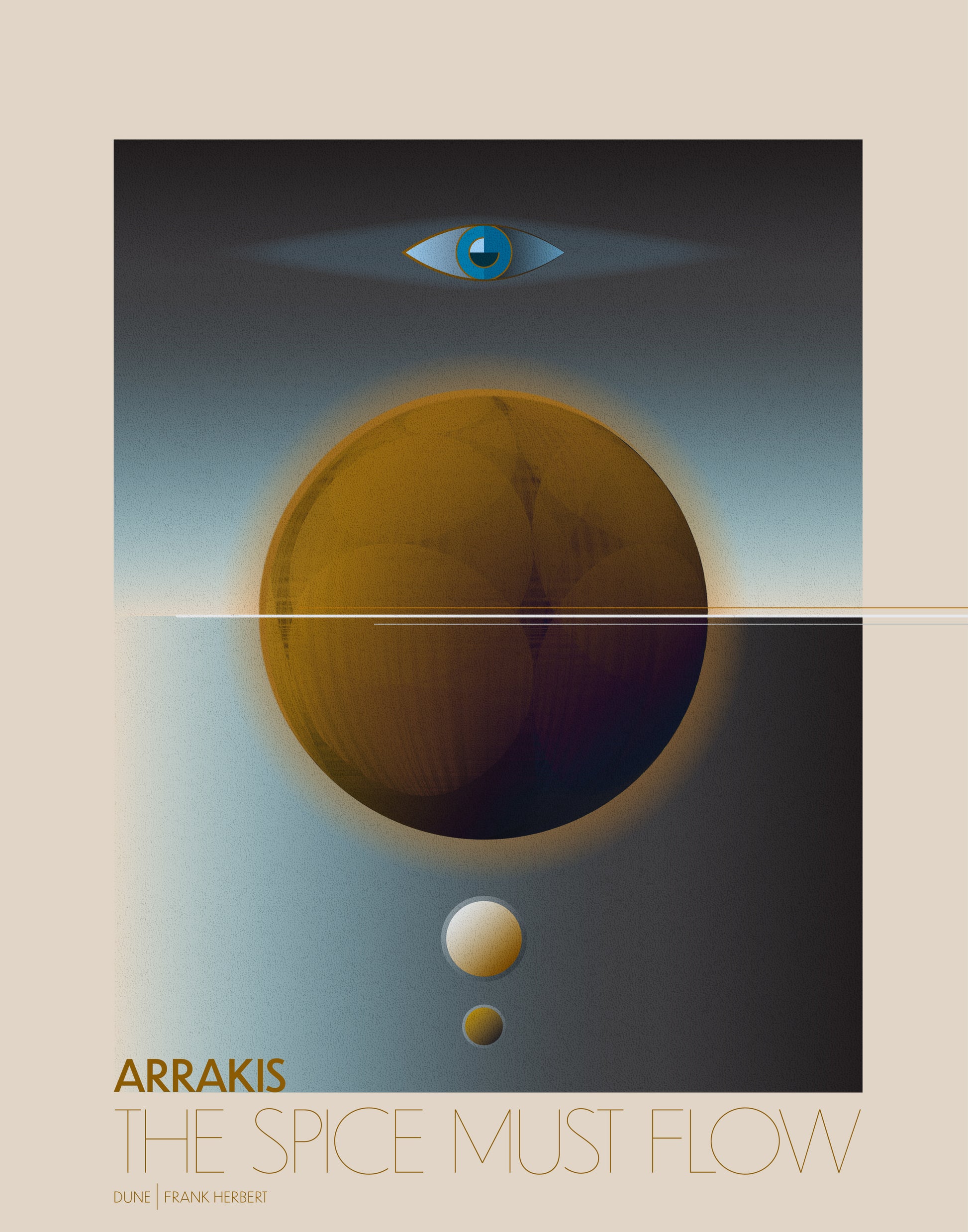 The planet Arrakis is shown with its two moons Krelln & Arvon and a blue Fremen eye.