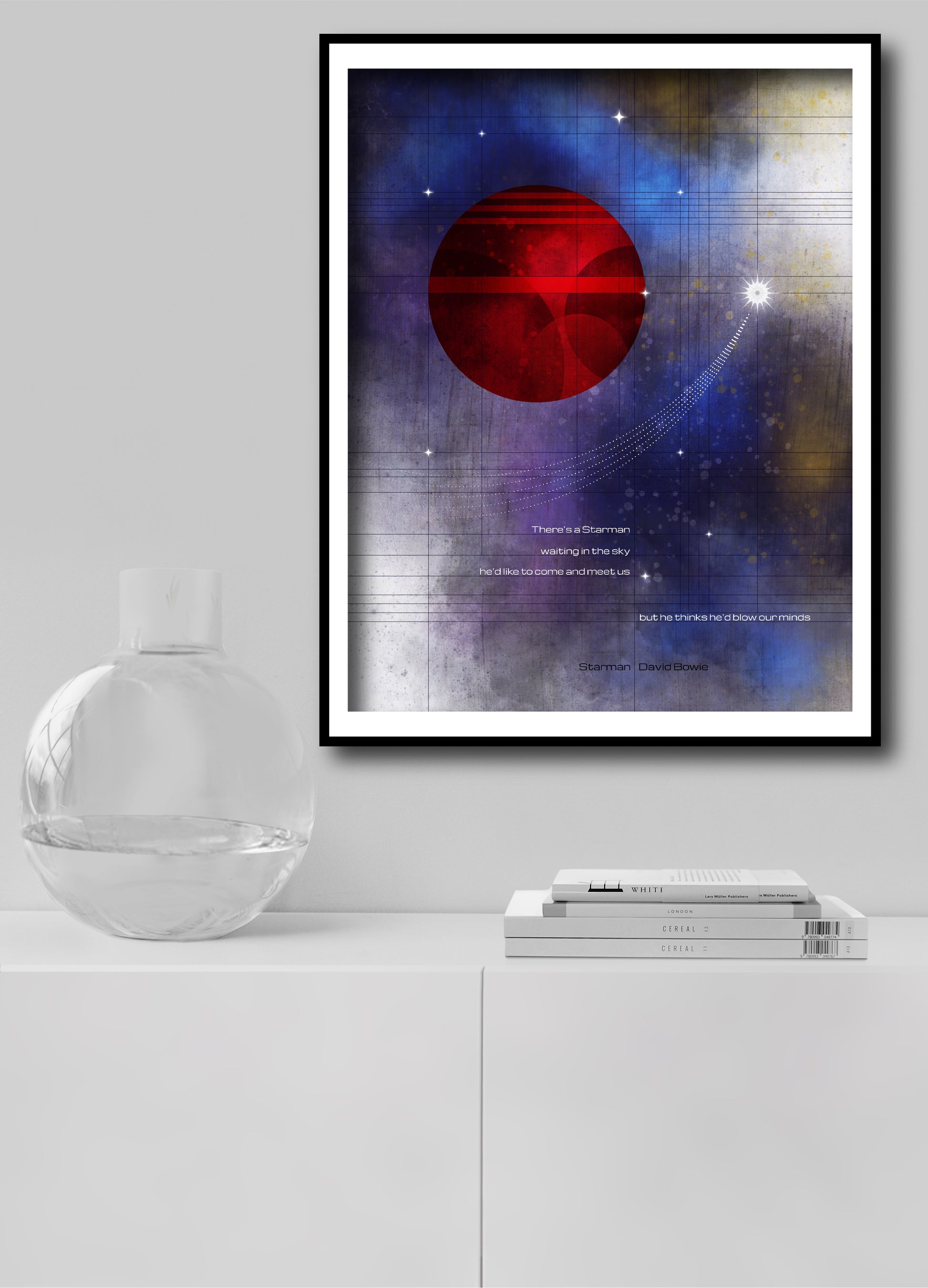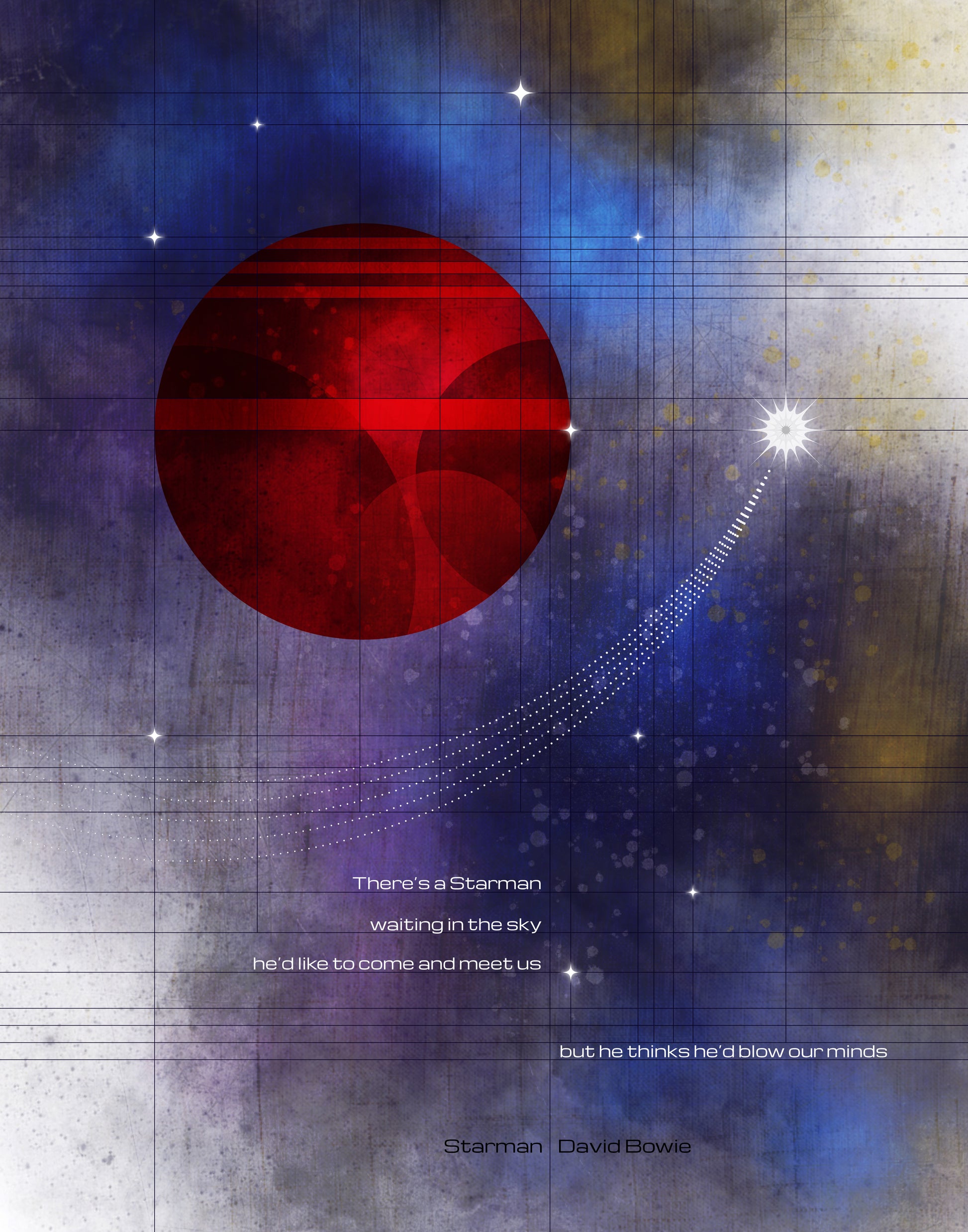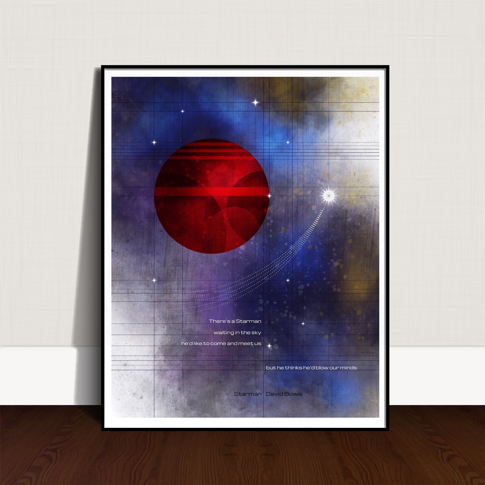 Inspired by the flight of Falcon Heavy. David Bowie lyrics to Starman are shown with Mars in a celestial sky.