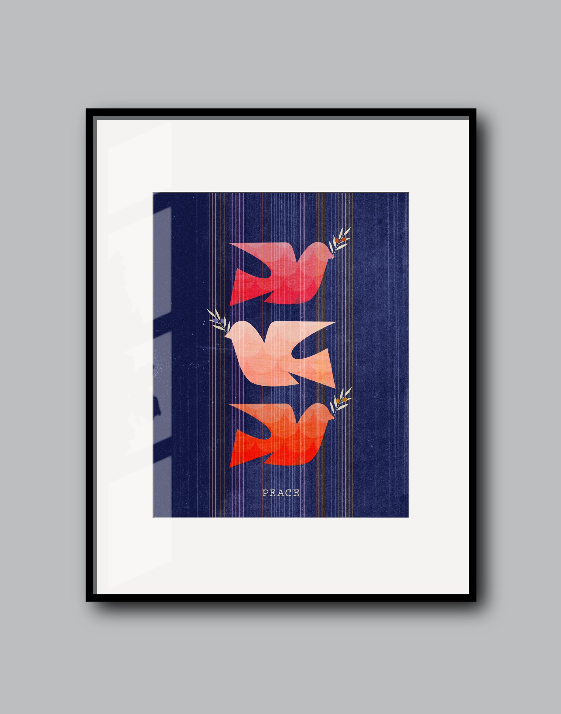 3 doves with olive branches on a dark navy background.