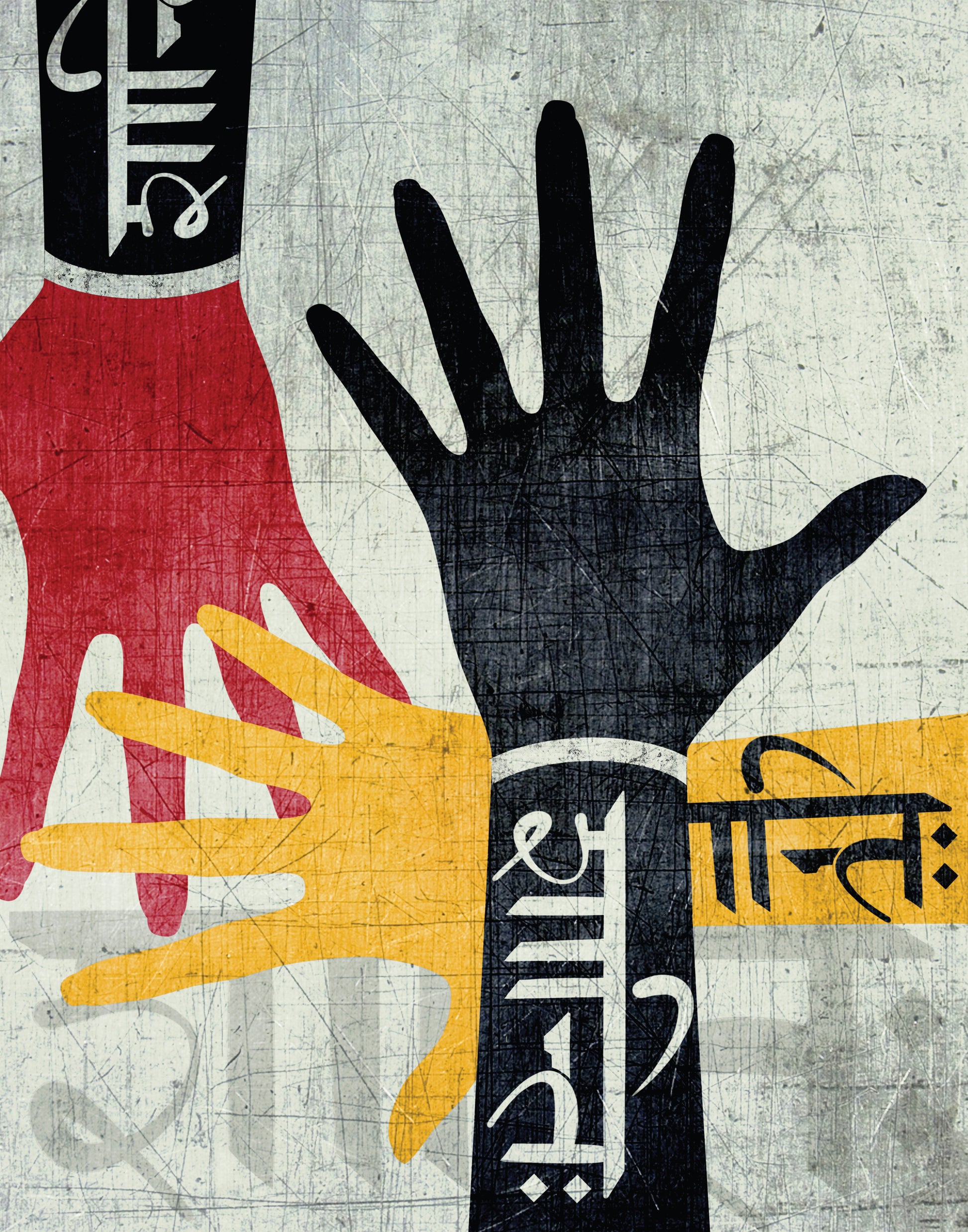 Shanti (Peace) is written in Sanskrit on varying hands in different colors.