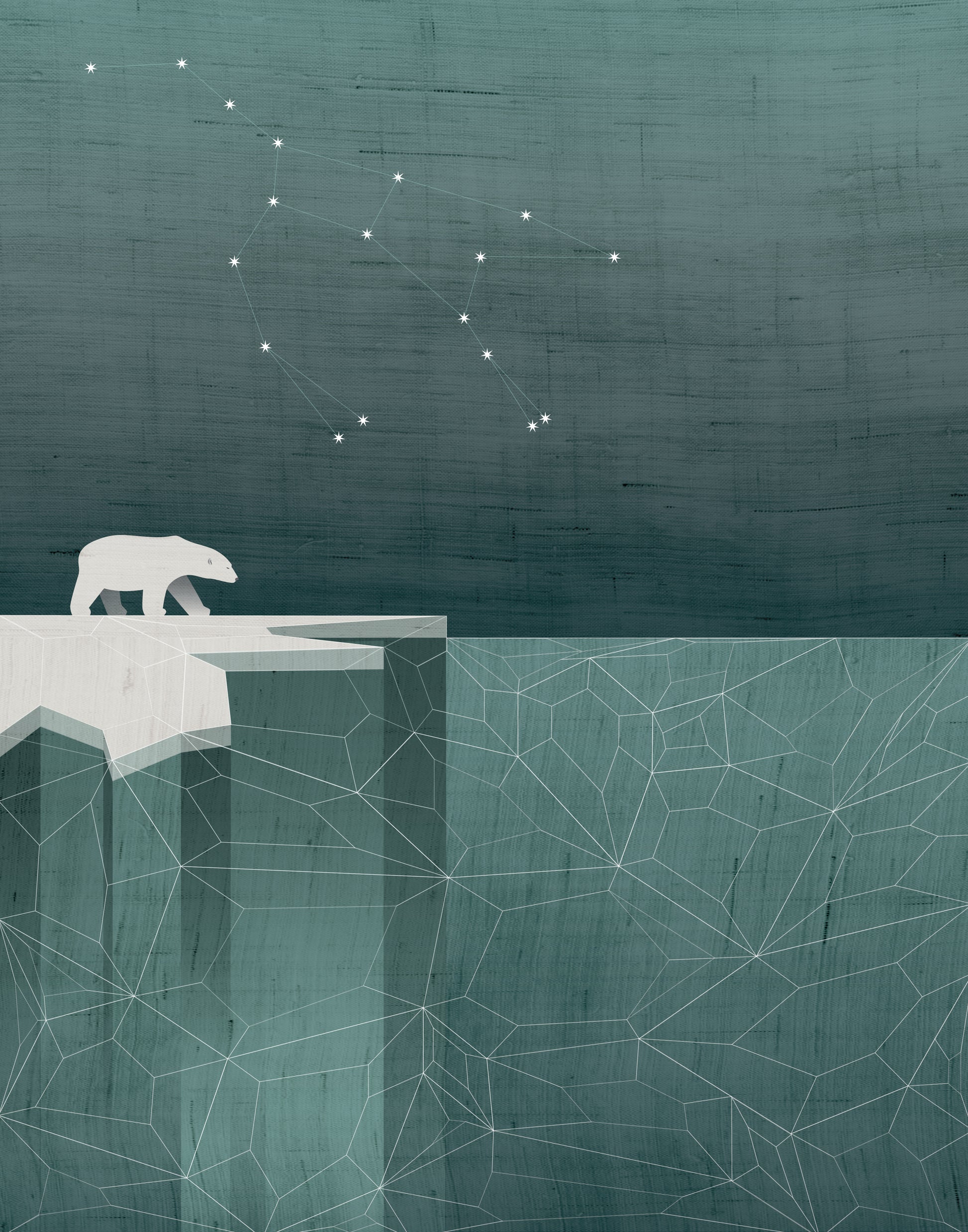 A white polar bear stands on the edge of an ice cliff with the constellation Ursa Major in the night sky.