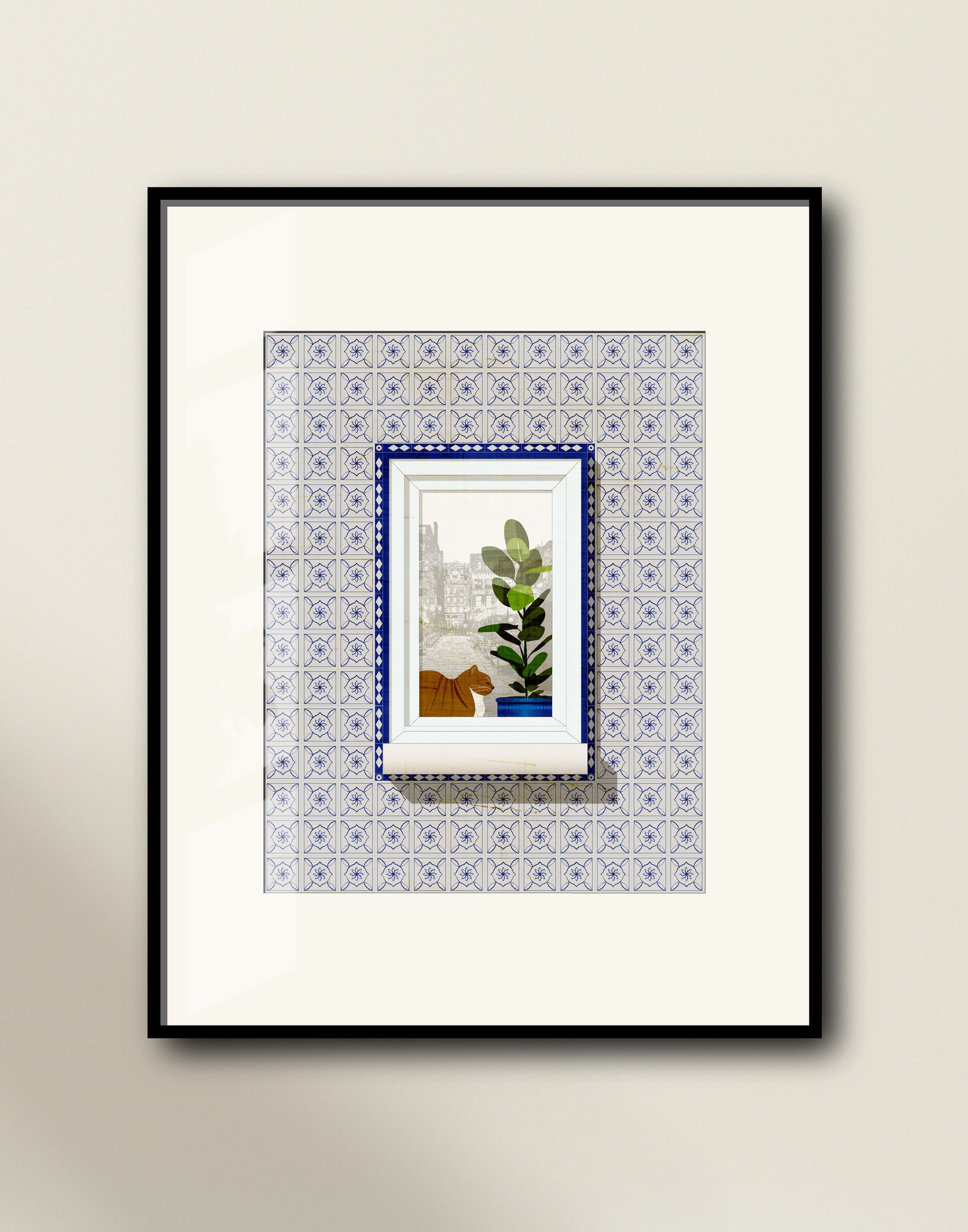 An orange cat loafing in a window in Portugal next to a tall rubber tree plant. Inspired by cats and the beautiful tiled facades of Portugal.